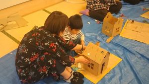 他のイベントで作り終わらなかったというご家族も2組来てくださって、とてもうれしかったです。こうしてハウスを持って来ていただくと、いつでもどこでも無料で続きが作れます。「旅するハウス」システムは、ワークショップを始めた2010年からずっと続けているので、うーんと前に作ったものを持って来ても全然大丈夫です。
