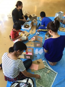 国民文化祭鹿児島大会の助成事業のひとつとして、県内にある子どもが住む有人島すべてに出向き、みんなでダンボールハウスを作り、その場でその中からそれぞれの島の代表にいいなと思うハウスをみんなで選び、鹿児島まで運び展示した2015年。